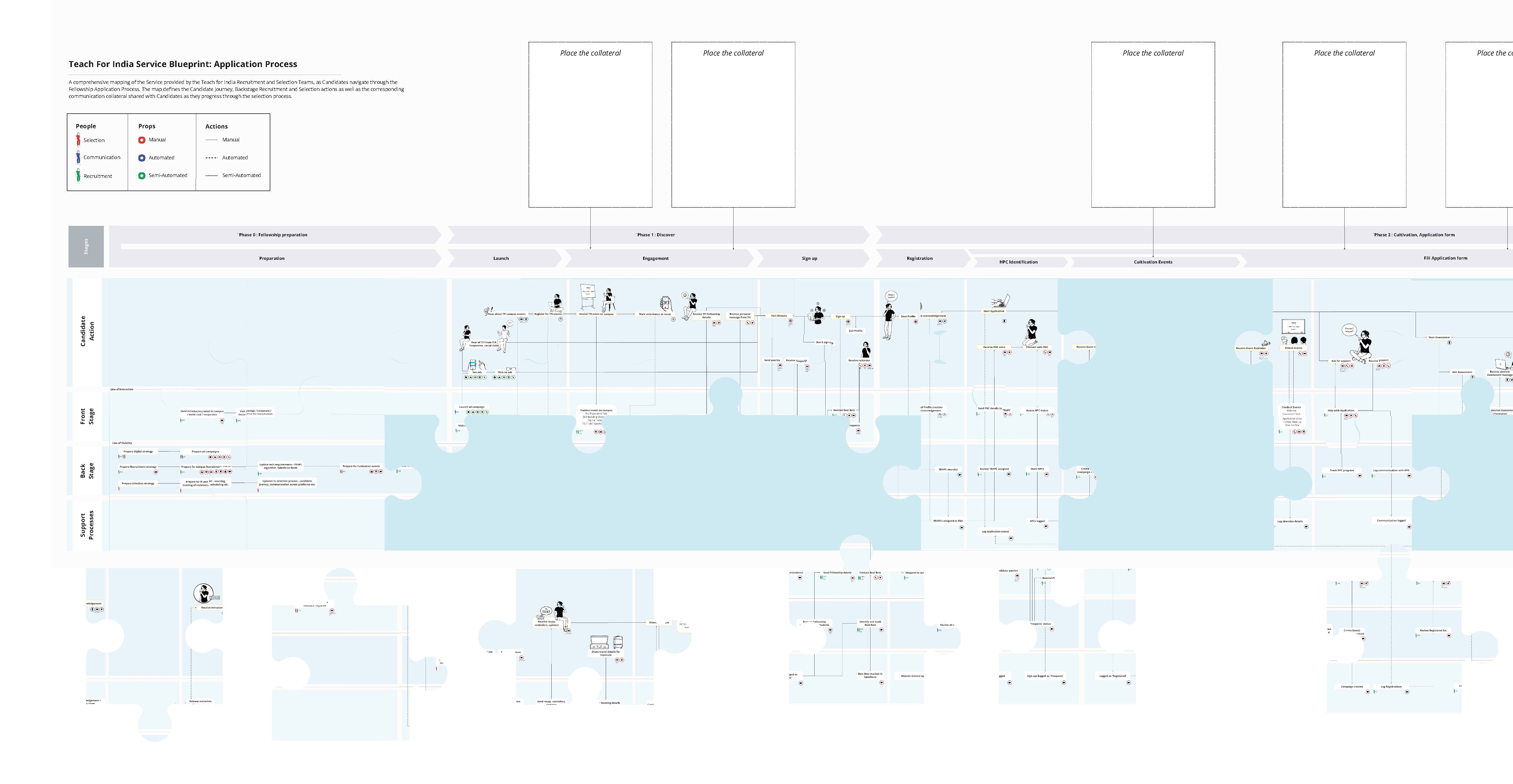 I joined the project as a designer, responsible for developing the user flow and mapping the end-to-end candidate journey through the Service Blueprint. While the initial mapping framework was in place, I led the ideation and refinement of the blueprinting approach, its development, and the subsequent templatization of key communication collaterals. I also contributed to data analysis and insight synthesis alongside the project lead, while independently executing all graphic design work. This was a highly collaborative project, with clearly defined roles and strong cross-team coordination throughout.